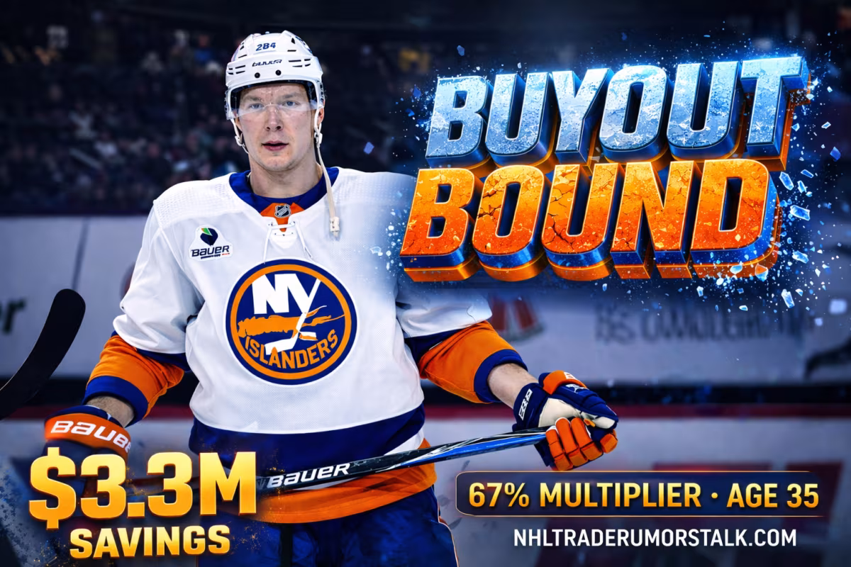 The net savings per PuckPedia's buyout calculator are $3.3 million in 2026-27 cap space, converting the Islanders' current -$3.8 million deficit into roughly $4.5 million of working room. The residual $1.65 million cap hit spreads across two seasons (2026-27 and 2027-28), which is absorbable given the projected $8.5 million cap increase coming next season and the Islanders' total projected 2026-27 cap space of around $50 million.